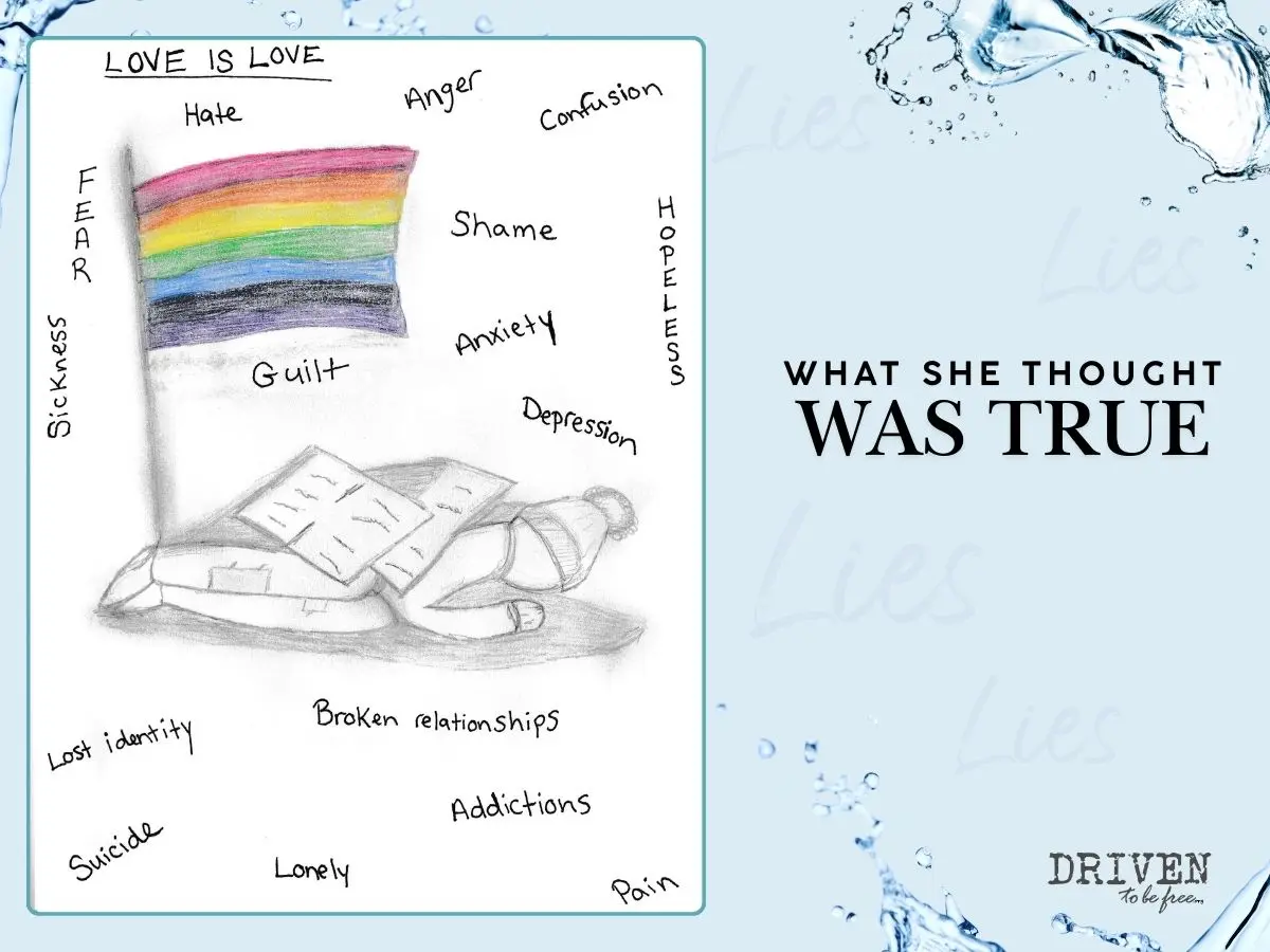 Jane began to cry. She saw a picture of herself with tattered clothes, covered up by old newspapers and all alone. She saw the words: anger, confusion, shame, hopeless, anxiety, shame… Jane also saw the pride flag. She so identified with the picture the Lord revealed; she knew it was the truth and knew no other way to think of herself.